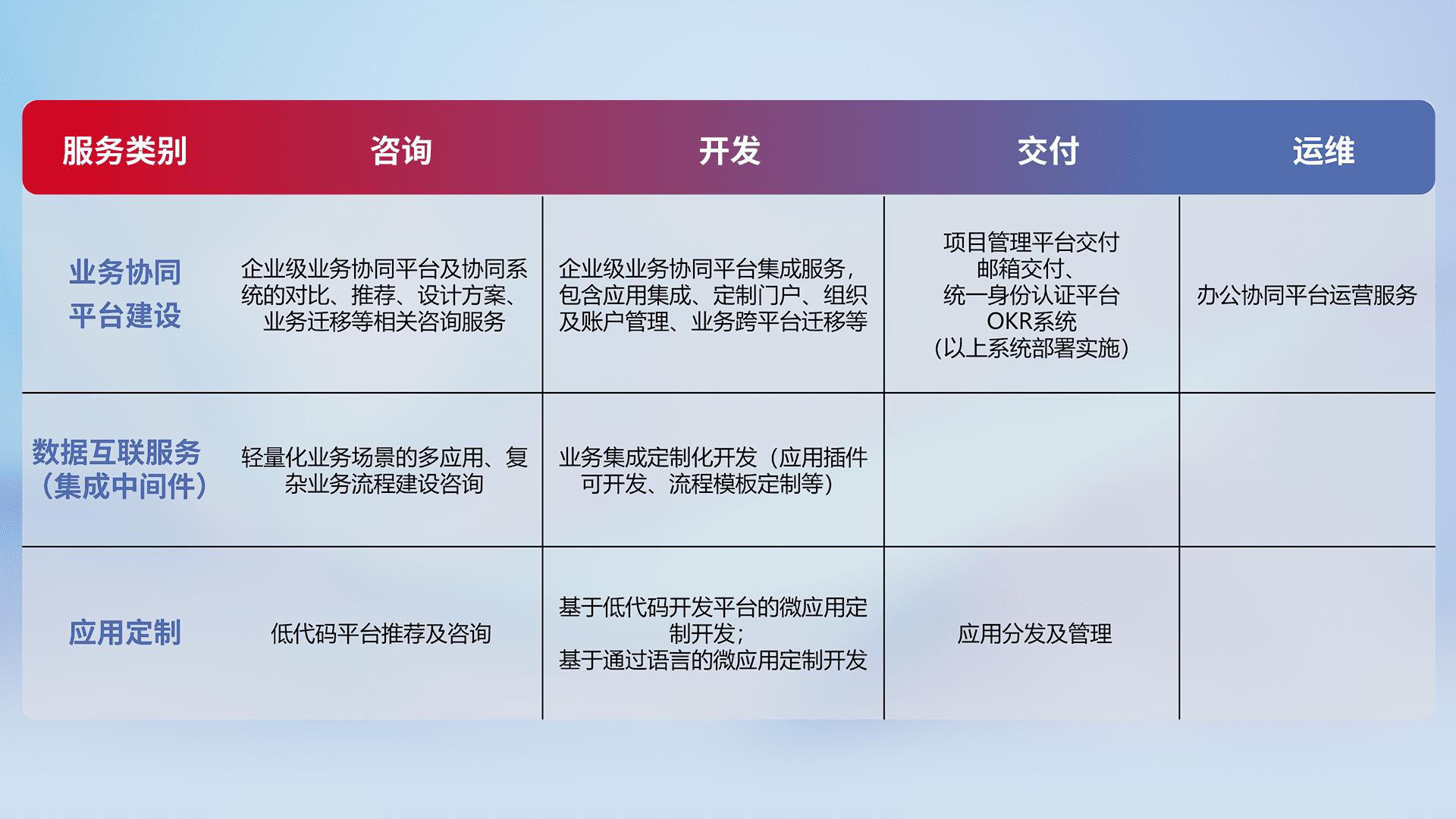 针对钉钉、、、、企微、、、IDaas等平台级产品提供产品的规划、、、方案、、、交付、、、定制化开发等服务,,实现如统一协同办公、、、、智能客户服务、、、、混合会议管理、、智能数据查询、、、等业务场景,,,实现数字化转型。。